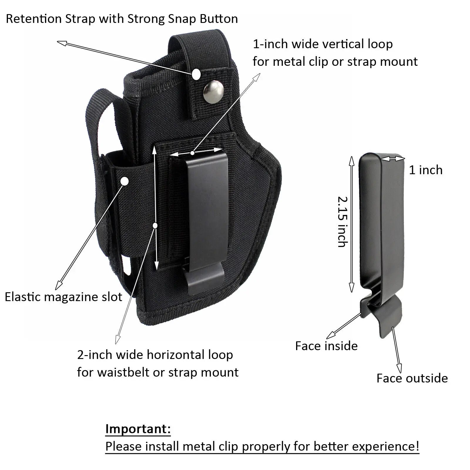 Metal Clip fits up to 2 inch wide waist belt.
